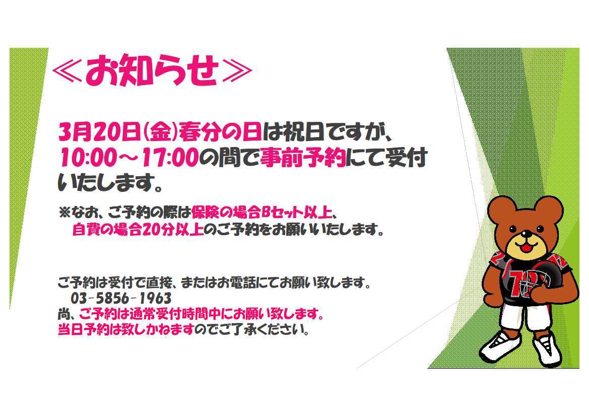 3月20日は春分の日で祝日ですが、事前予約にて受付いたします。