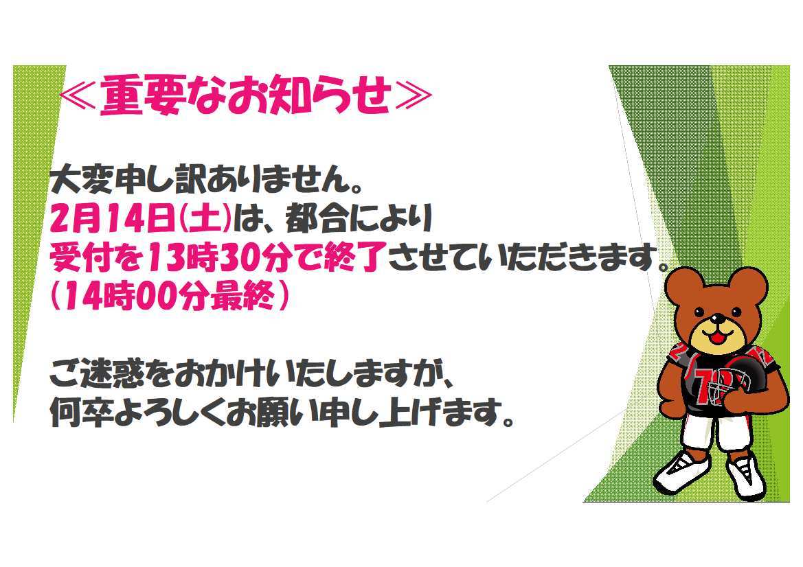 2月14日(土)は30分短縮させていただき、13:30までの受付とさせていただきます。