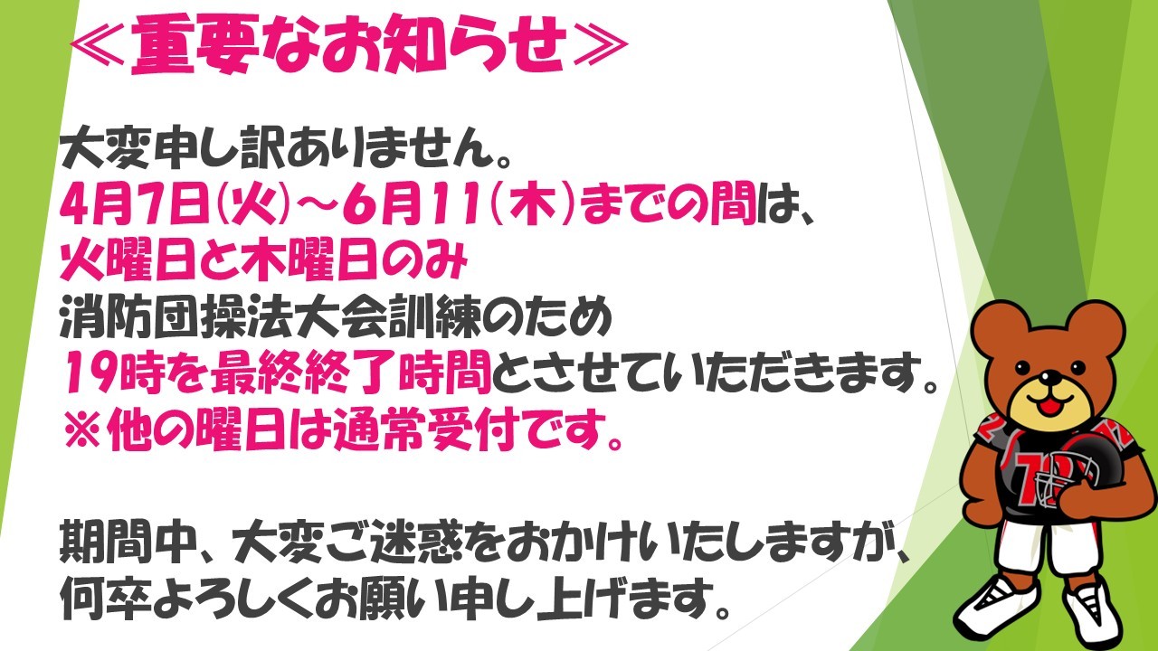 4月7日(火)より6月11日(木)の間の火曜日と木曜日のみ19:00を最終の終了時間とさせていただきます。